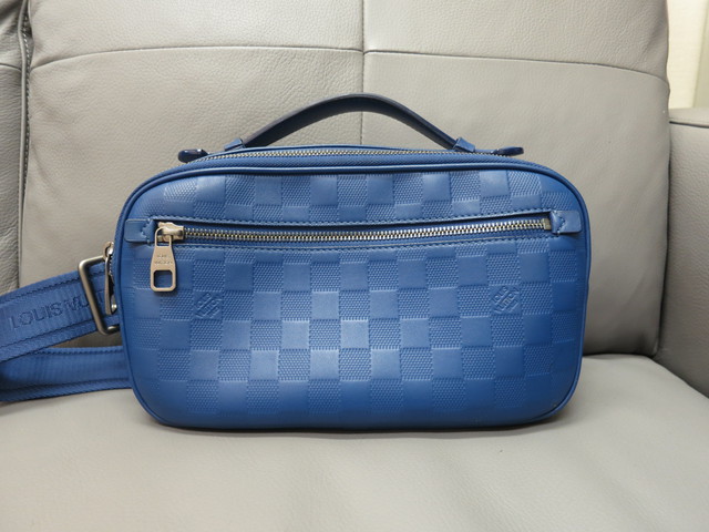 ダミエ・アンフィニレザーを使用したハンドル付きのボディバッグ「アンブレール」のネプテューヌ(青色)を買取させて頂きました。
