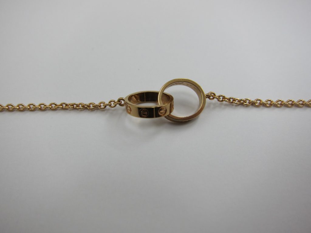 ビスモチーフで知られるLOVEコレクションのブレスレットといえば、’ラブブレス’と呼ばれるドライバーで着脱するバングルタイプのモデルが一番有名で人気も高いですが、今回買取させて頂いたのは’ベビーラブブレス’と呼ばれる華奢なチェーンブレスレットタイプのモデルです。