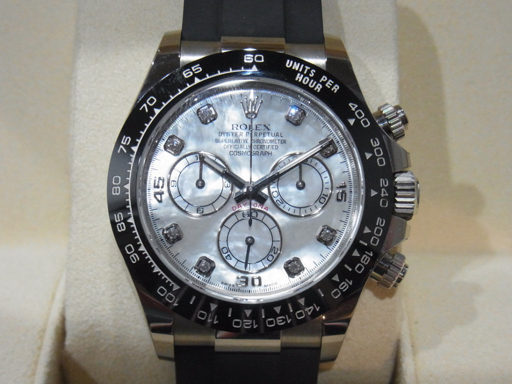 非常に美しいダイヤモンド入りホワイトマザーオブパールダイアルが合わさった、18ctホワイトゴールドデイトナ、「116519LN」を買取いたしました。